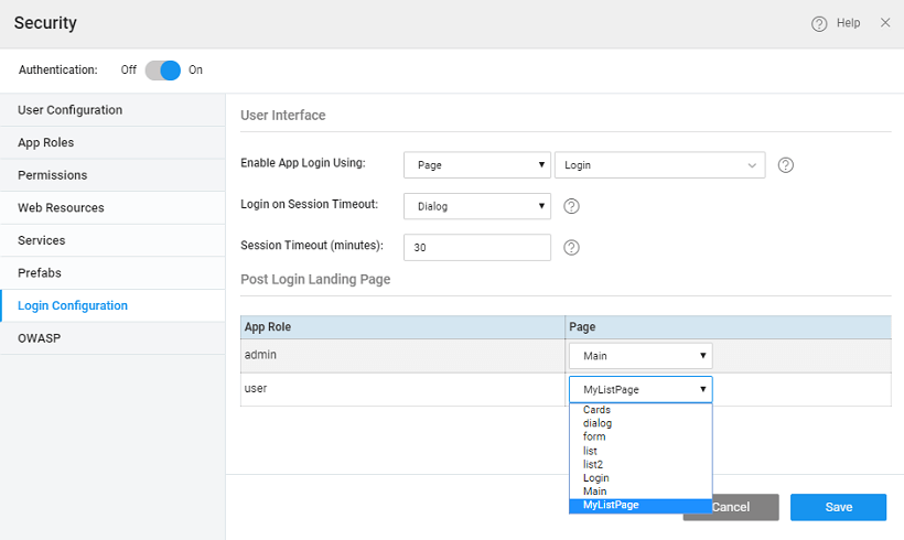 - How the Login should be handled: using a login page - you can use the default login page provided by Studio or create your own page;