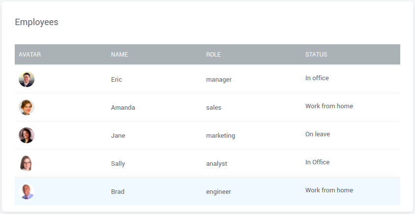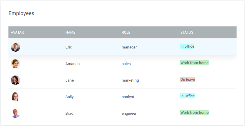 In the following example, we are looking at the same example used for Datatable to render HTML, which is employee's current status.
