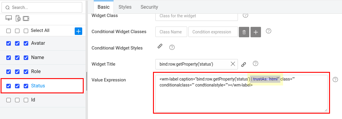 Following example shows the Value Expression field configuring trustAs formatter for the status column.