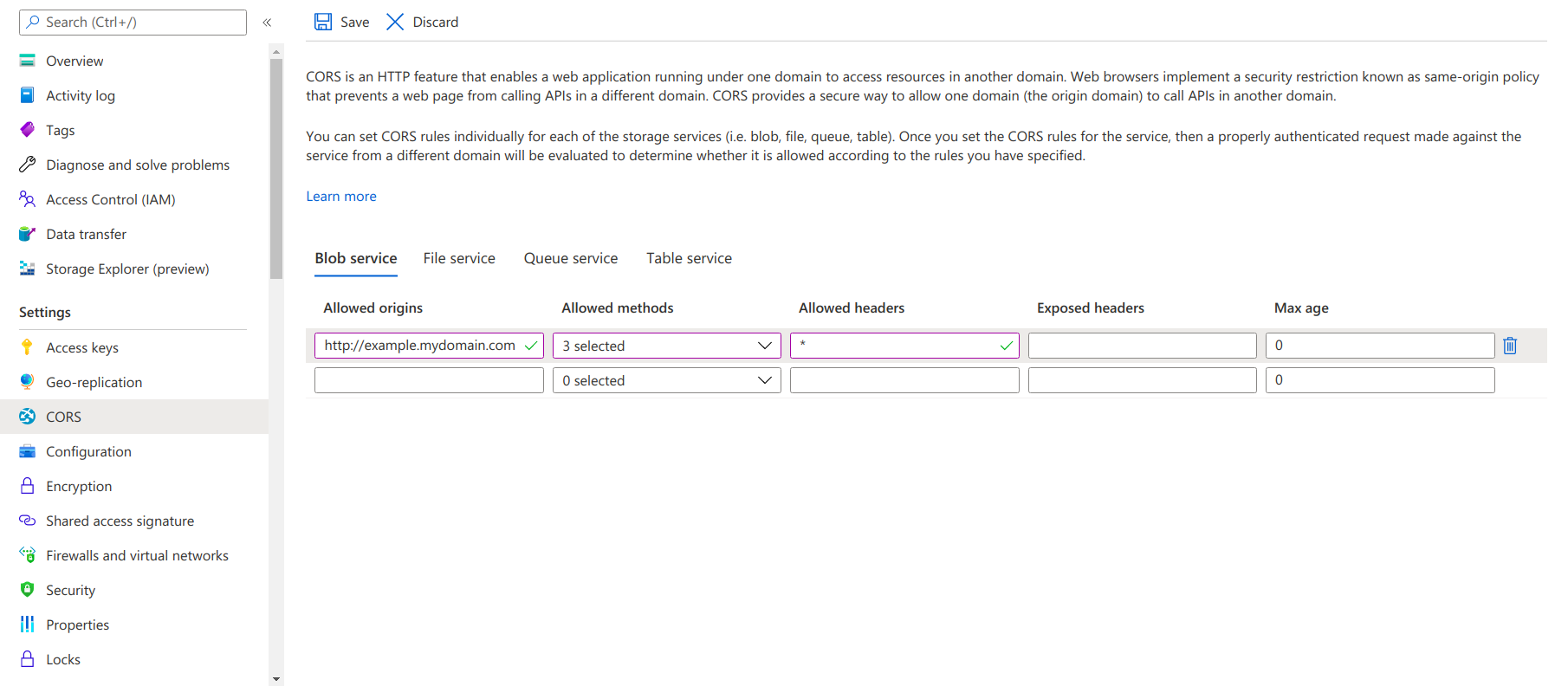 .Enable CORS If the web application is loaded in one domain and the frontend code in the Azure storage container is loaded with a different CDN domain.In the Azure storage account select CORS under settings to enable.
