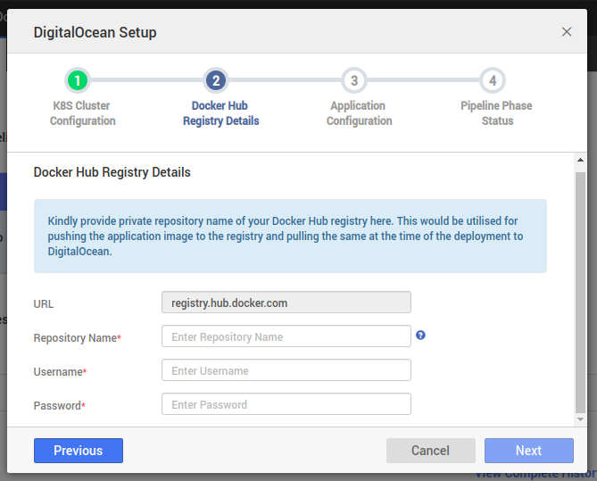 as we are supporting only the docker hub registry for now. - Repository Name: To enable only private push and access of images, you should provide a private repository name. To create a private repo in Docker Hub account, see Private repositories.