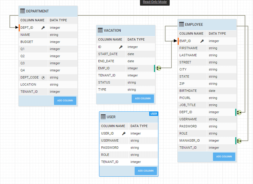 As an example, we are using the following Employee-Department Database Schema (Sample hrdb that can be imported into Studio) with a unique constraint for Dept_code