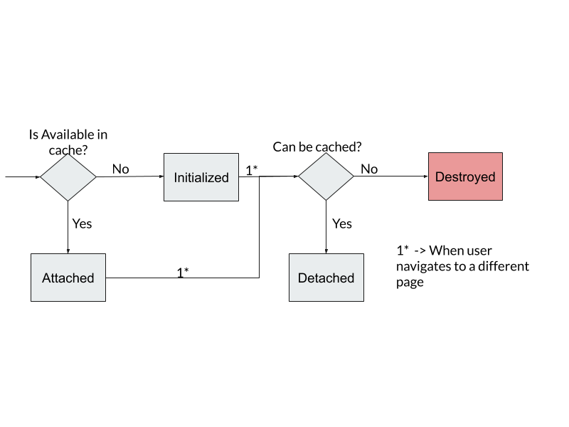 Step | User navigated to | Initialized | Attached | Detached | Destroyed |