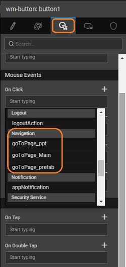 Binding the Navigation Action to a Widget event - For example Button click – Use the button’s onClick event to trigger a Navigation Action to move to a new page or view.