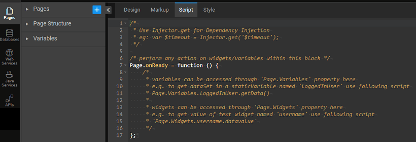 Page script can be accessed from the script tab on your project workspace. Using JavaScript, the functionality of your project can be enhanced. The various methods and properties associated with each of the Studio elements can be found in the API Documentation.