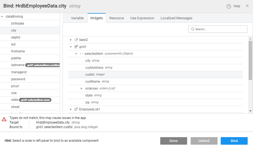 - The Bind dialog displays the binding options i.e. a list of everything that you can bind to, including all variables, widgets and so on. You can bind to widgets, variables that are defined on the current page, or that are defined at the app level.