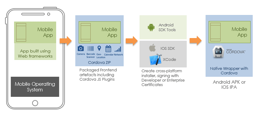 The Automated Build process for a mobile application within WaveMaker can be used to generate a .apk (Android application package) or .ipa file (iOS App Store package). Downloading Cordova/PhoneGap compatible .zip files can be used to build systems manually for Android/iOS platforms.