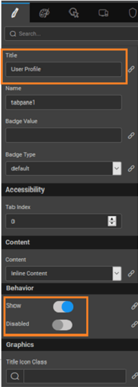 Default Pane Index | This property sets the default active pane on a load of the widget based on the provided index. The Tab Index is an integer starting from 0, 1, 2, and so on. That is, setting this property to 0 will display the first Tab pane; setting to 1 will display the second Tab pane. |