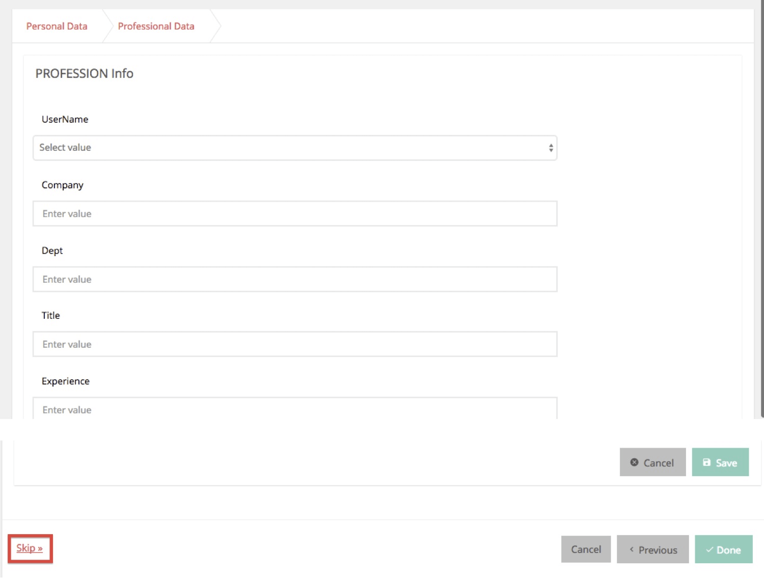 - On Done: Use Case –When the User is Employed. In this case, the user is allowed to move to the next step to enter professional data. Once entered and Done button is clicked, On Done event fires. A JavaScript handler is added to On Done Event which does the following: