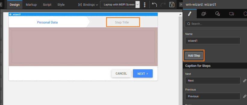 - Content: The content can only be an inline content which means that you have to design each step of the wizard like you design every page in WaveMaker. You cannot use partial content in any step of the wizard.