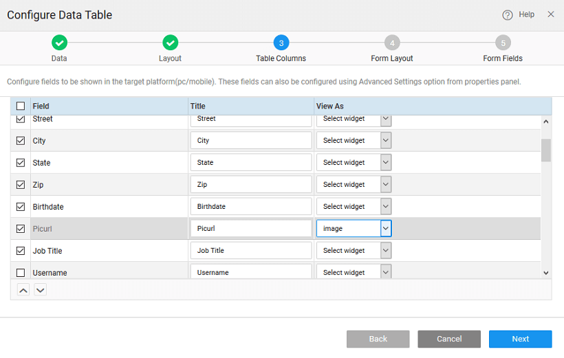 If you select the Data Table layout without Form in step 2, the Done button appears after this step. Click the Done button to add the Data Table to the current page. If you select other layouts, then additional two steps to do include select the Form layout and select the Form fields.