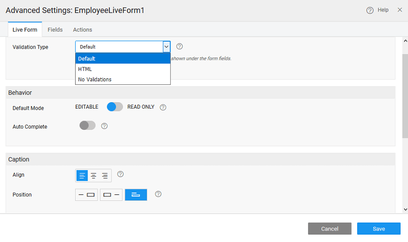 Set the value or bind to another widget like Data Table, List or Live Filter. These define the values that display when the Live Form loads.