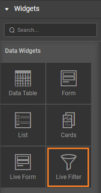 To add filter capabilities to your app, drag-and-drop the Live Filter widget and bind the result from the Live Filter to the desired widget like Data Table or List.