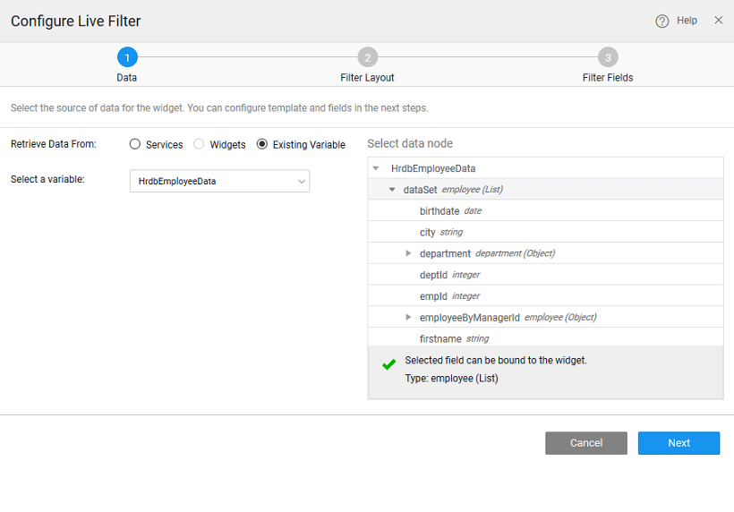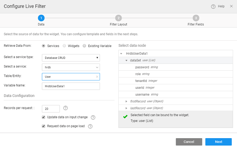 There can be different scenarios to deal with when configuring your Live Filter Widget with a data source. The data source can be in the form of a variable created from a database CRUD API autogenerated at the time of Database Integration or from an another widget on the page.