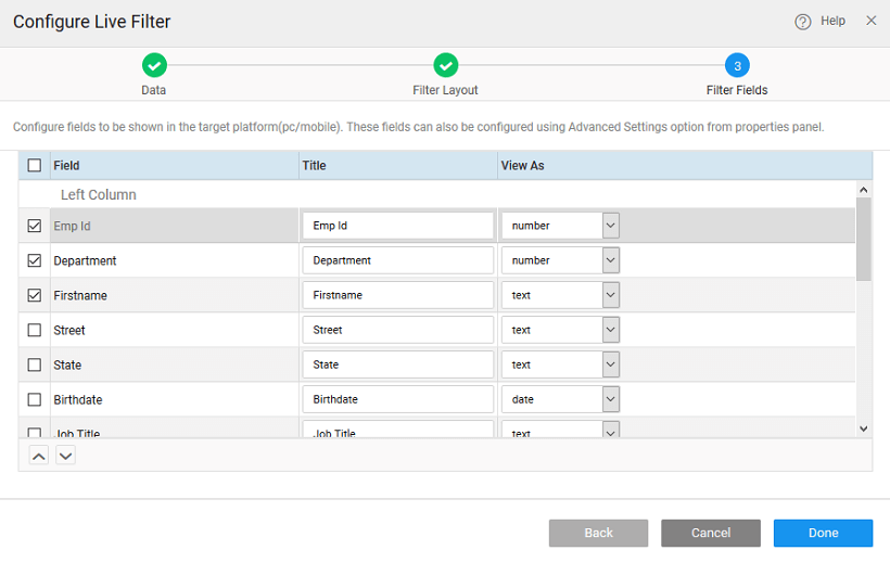 Once the data source and layout are selected, you can set the filter fields. You can choose the fields to be displayed on the filter by selecting from the list and set the appropriate widget for the fields. Click on the Done button. Now your filter is ready.