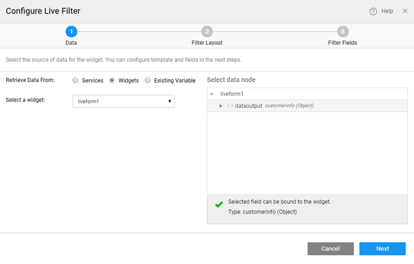 3. You can select data node to be the entire widget or the selecteditem node in case of another Data Table or List or Cards or result from a Live Filter