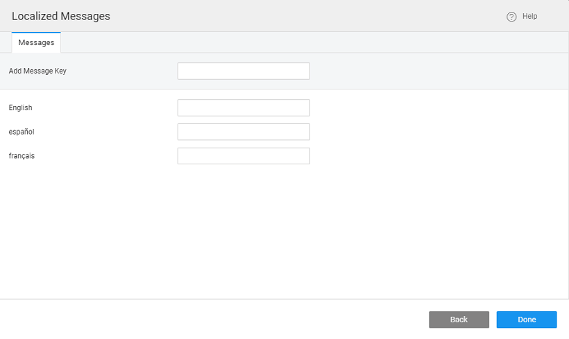- Localized Messages dialog shows a list of localized text in the current application. The localized text appears as a dictionary of keys and values in different languages.