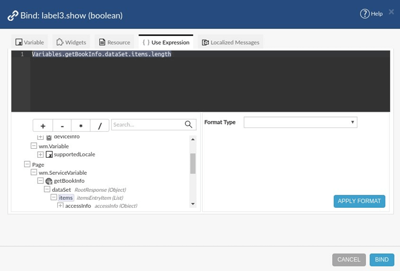 - Drag and Drop a Label to the page, set Caption property to ‘Book Not found’. Bind the Show property this label such that this label is shown when the Variable does not return any books.