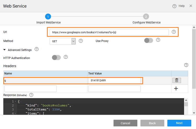 - Use the following Url: https://www.googleapis.com/books/v1/volumes?q={q}
