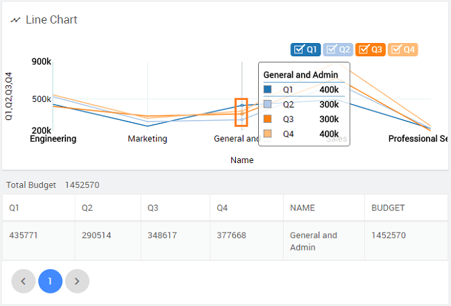 Drag and drop a Line chart onto the first Grid row. Bind the chart widget to the Department dataset, and set x-axis to deptCode and y-axis to Q1, Q2, Q3, and Q4