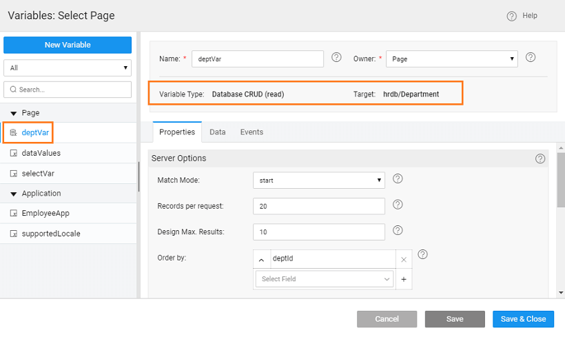 - Bind the Select widget to a database. Here we are using the Department table from the hrdb, import the sample db that comes shipped with Studio and has been imported earlier and Create Database CRUD Variable