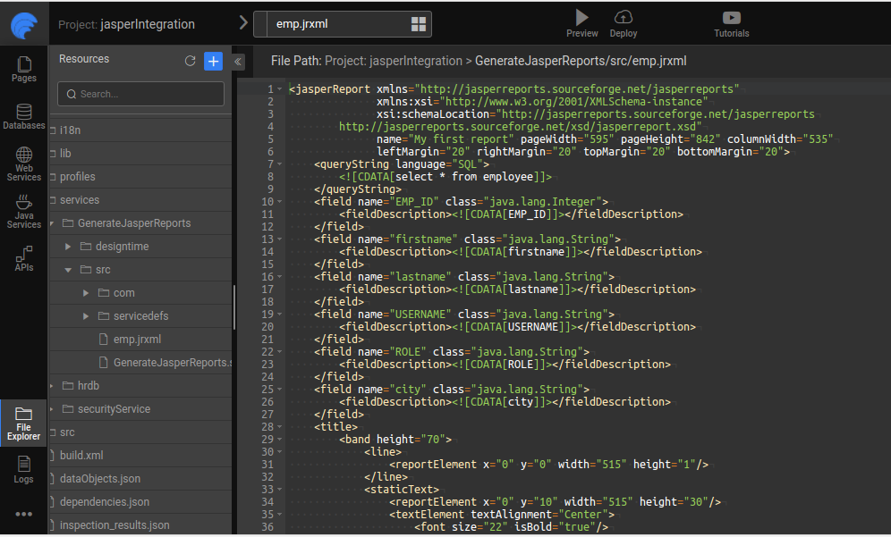 folderThe following sample report jrxml is provided for your reference which loads the data from hrdb Employee table and generates the report.