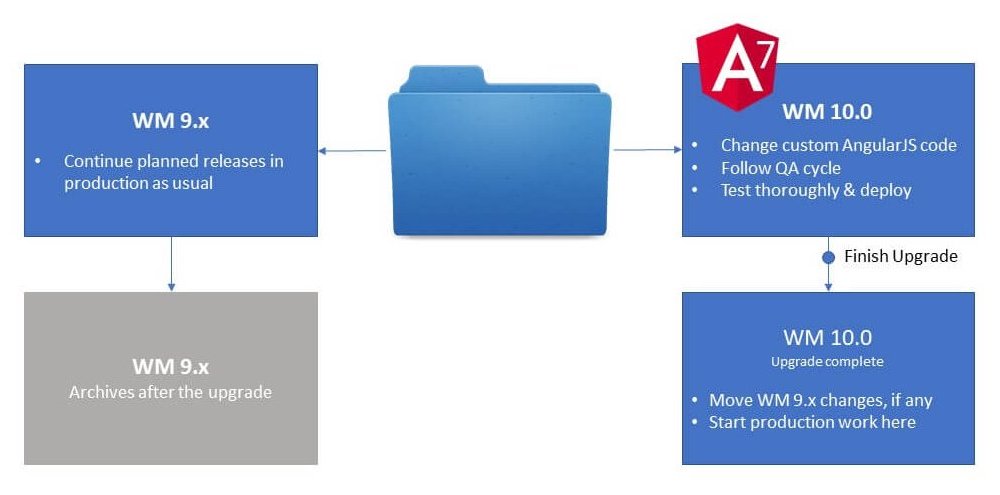 • Approximately, there is a 6 months time limit to complete the project upgrade. If your app currently runs on WM 9.4 or lower versions, it is important that you start upgrading your project to WM 10.0, and have complete control over the upgrade process. If you do not upgrade your projects within the given 6 months period approx., the projects automatically upgrade to WM 10.0. Therefore, you could lose the opportunity to manage individual versions of your app with our multi-version control system.