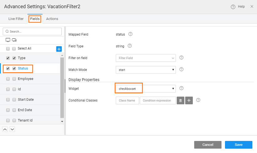 - Set the Widget Display Property for Status field to Checkboxset.
