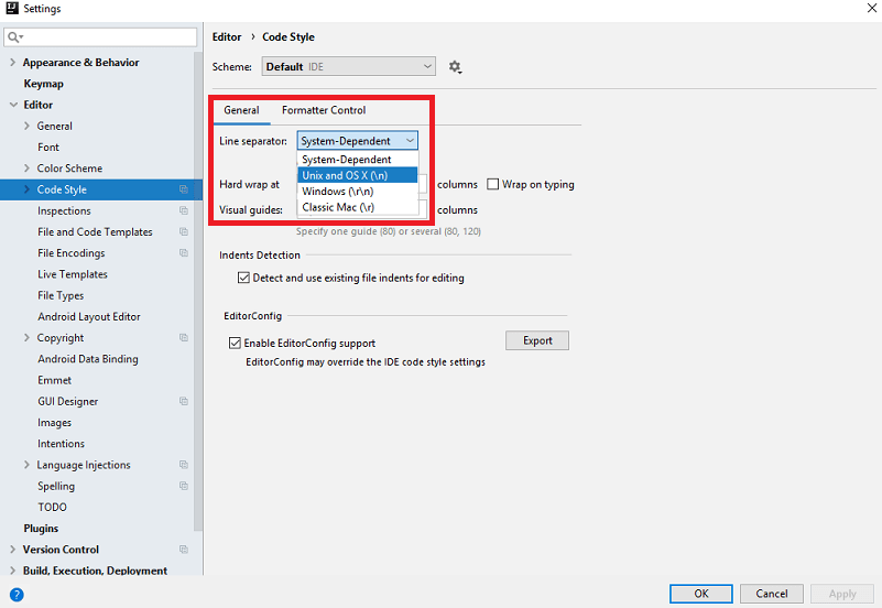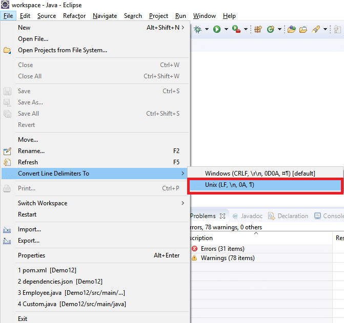User has to select the project and convert line delimiters to Unix.