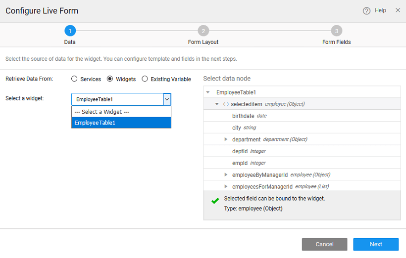 - Select the Data Node: You are given the option of choosing either the entire dataset – when you are binding the widget to a data source or any of the fields in the dataset – from Select data node tree when binding a single widget or a List item to a field in the dataset.