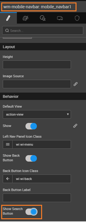 - Select mobile navbar and set the ‘Show Search button’ from the Properties Panel.