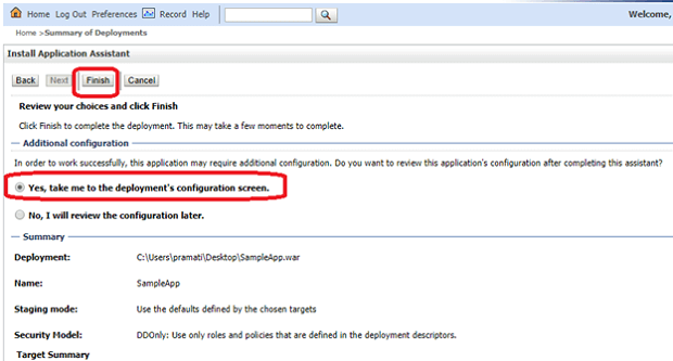 - Select 'Yes, take me to the deployment's configuration screen' and click the Finish button.