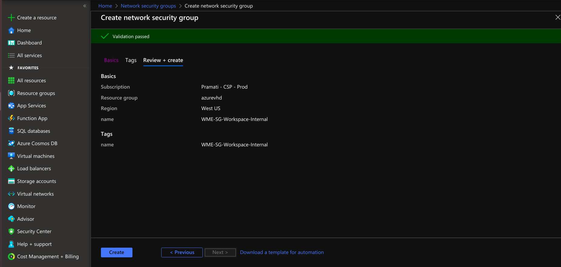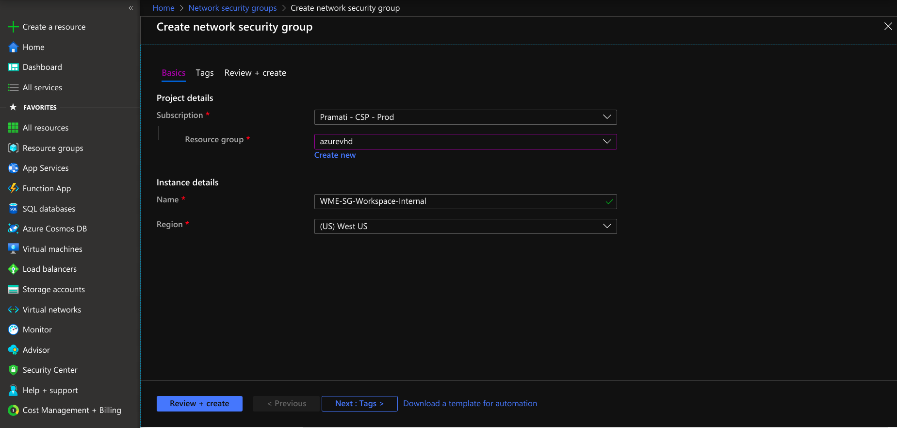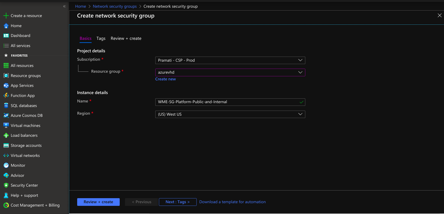 • Provide tags that are name-value pairs for the network security group for categorizing the resources.