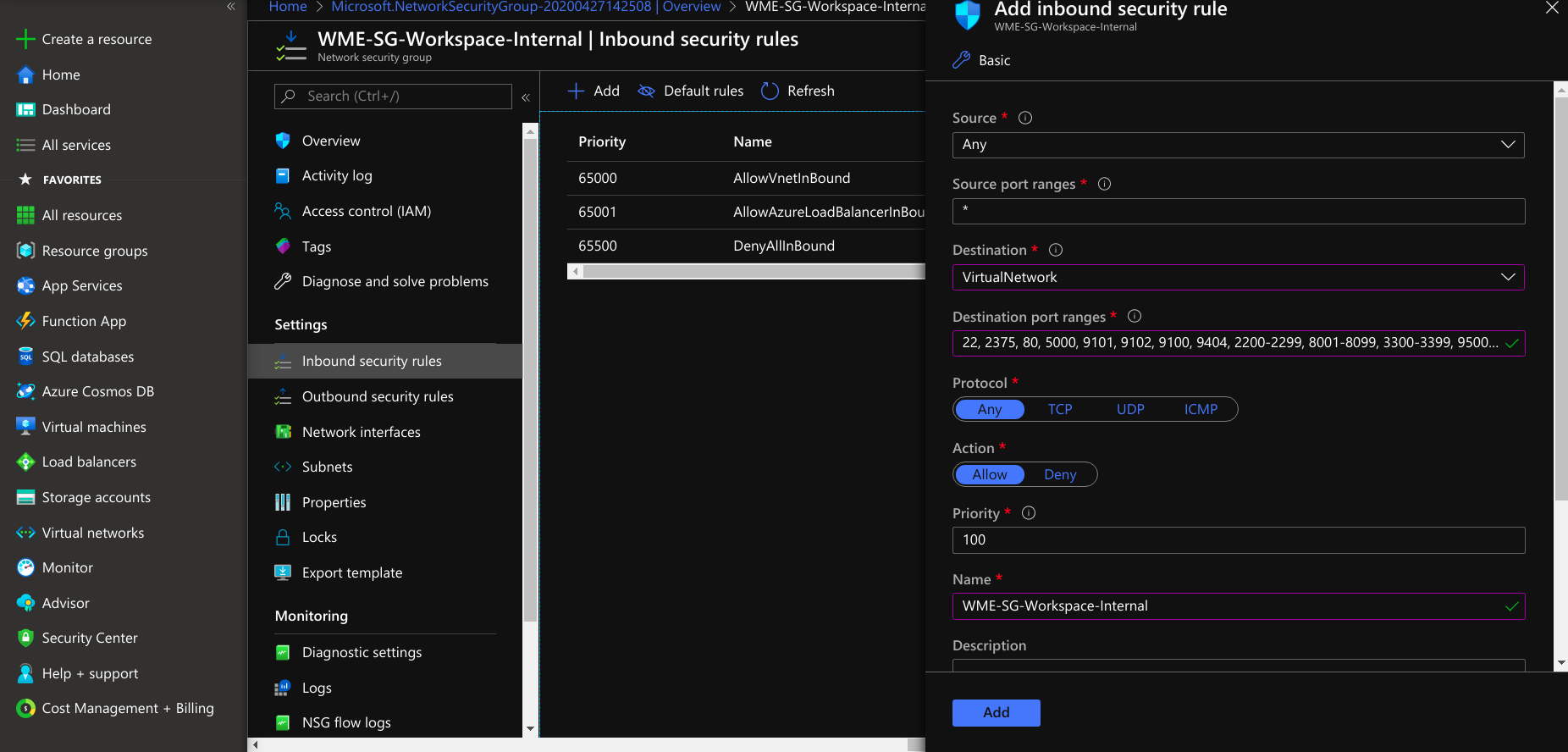 Creation of Network Security Group for Studio Workspace/App Deployment Virtual Machine