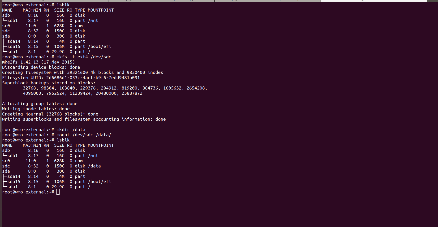mkfs -t ext4 /dev/sdc
