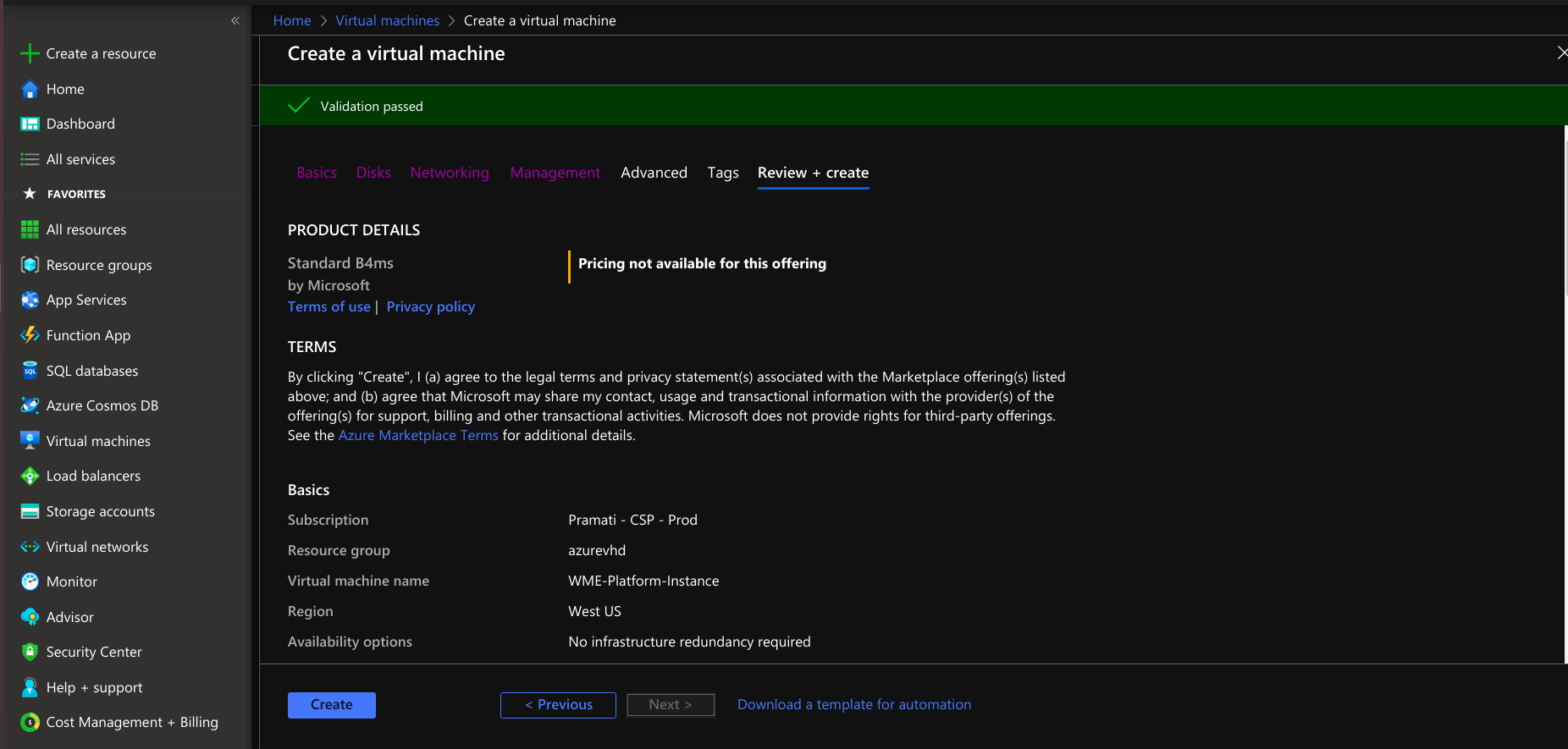 • After reviewing the virtual machine select creation option for creating a virtual machine.