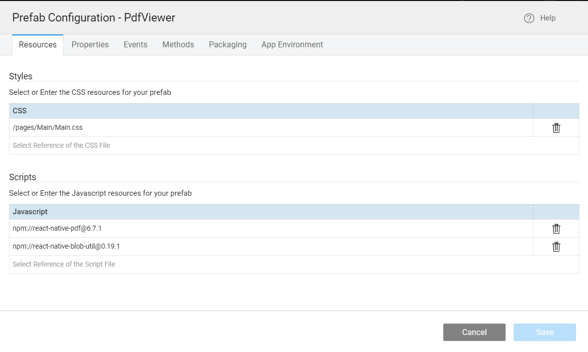 Click on setting then click on Config Prefab. Now, select Resources tab and In Script section add react-native-pdf